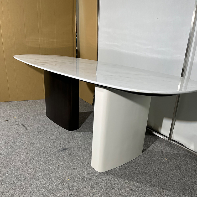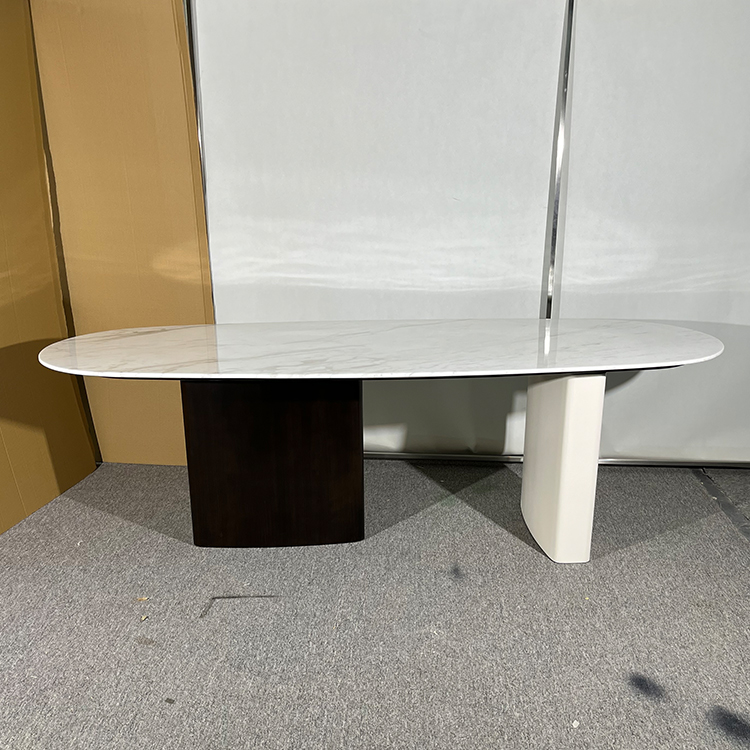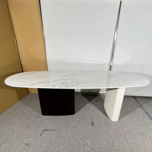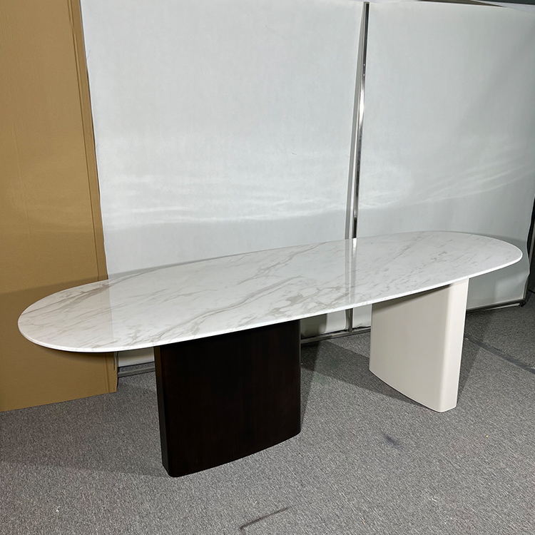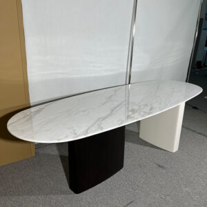 Elevate your dining space with this modern oval white marble dining table. It features a sleek polished marble top & unique mixed-color base, blending luxury & contemporary style. Perfect for 6-8 seats in dining rooms, this durable, stylish piece is a statement furniture for modern homes.